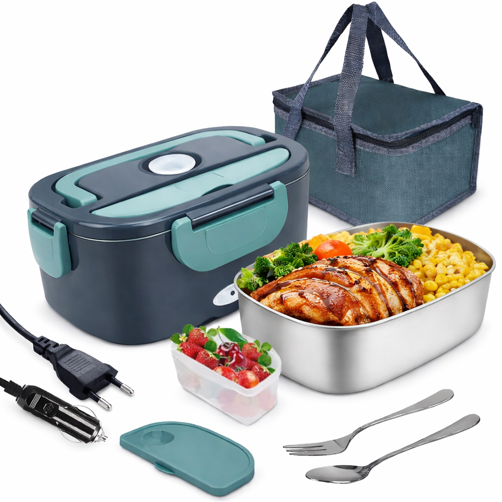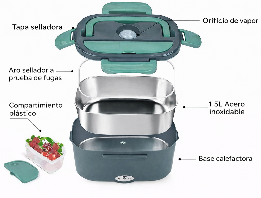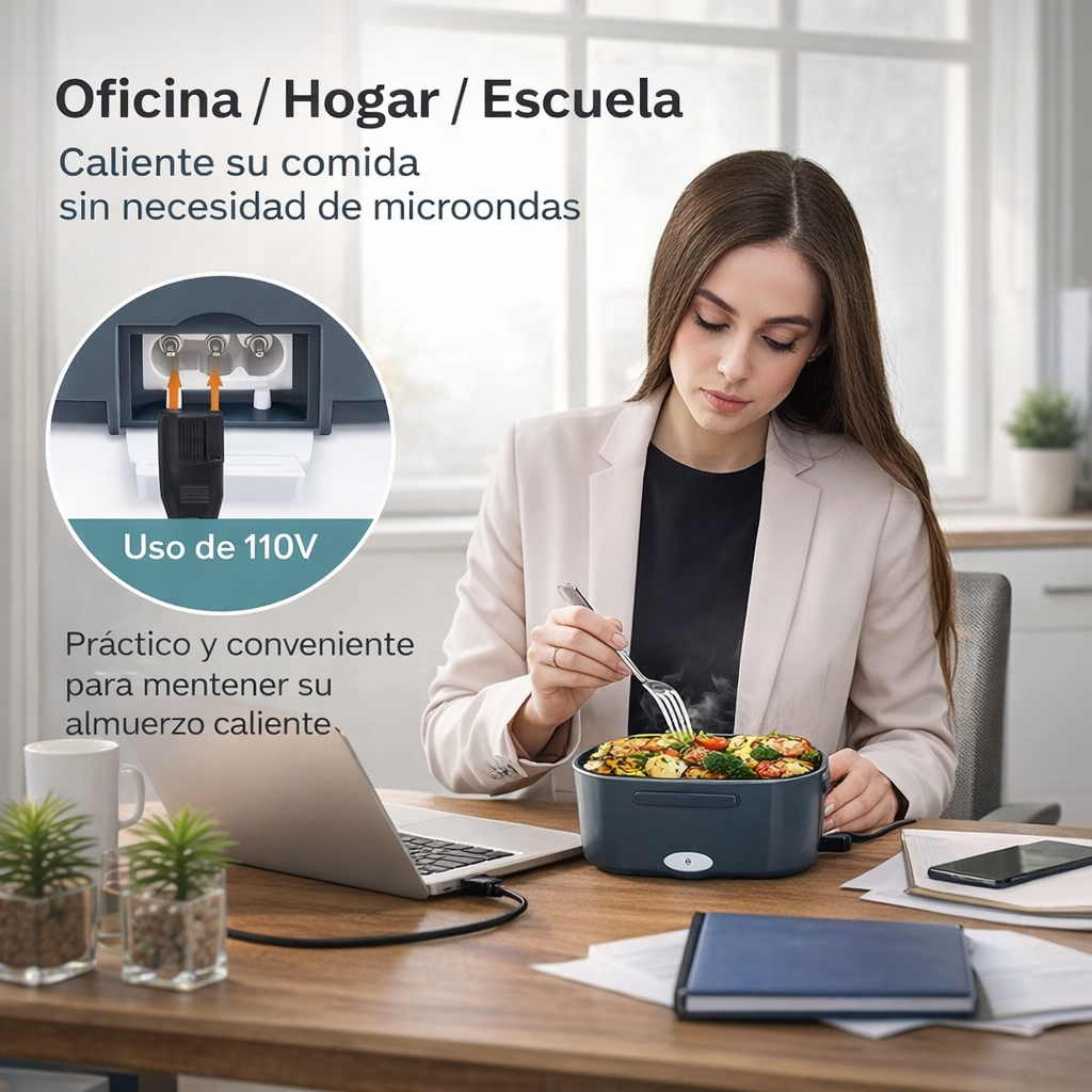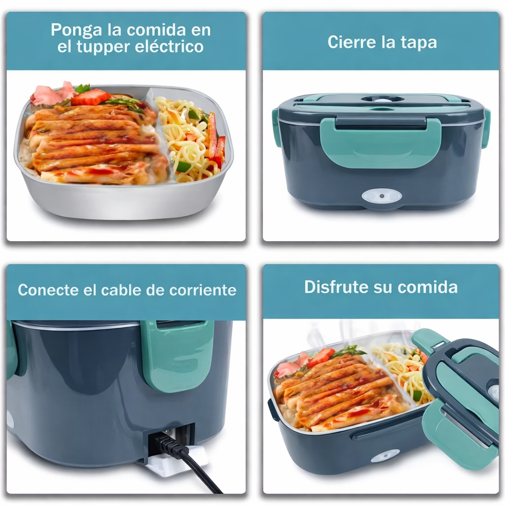 Este tupper eléctrico es la solución perfecta para disfrutar de comidas calientes y caseras estés donde estés. Diseñado para el trabajo, el hogar o la escuela, te permite calentar tus alimentos de forma uniforme sin necesidad de microondas, conservando mejor el sabor y la textura de cada plato.